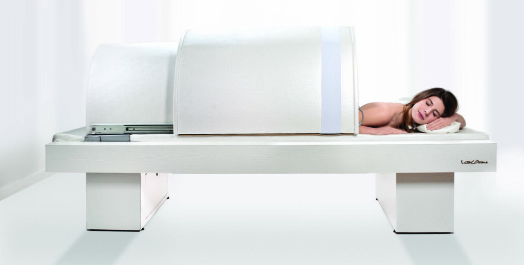 Le patient se repose confortablement dans une cabine chauffée par des infrarouges, stimulant le bien-être général.